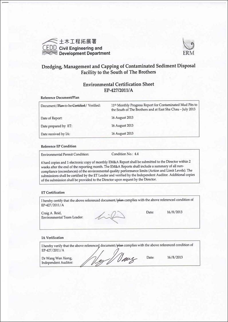 for ESC CMP V and on 23 December 2011 for SB CMPs respectively. Under the requirements of the EPs, an Environmental Monitoring and Audit (EM&A) programme as set out